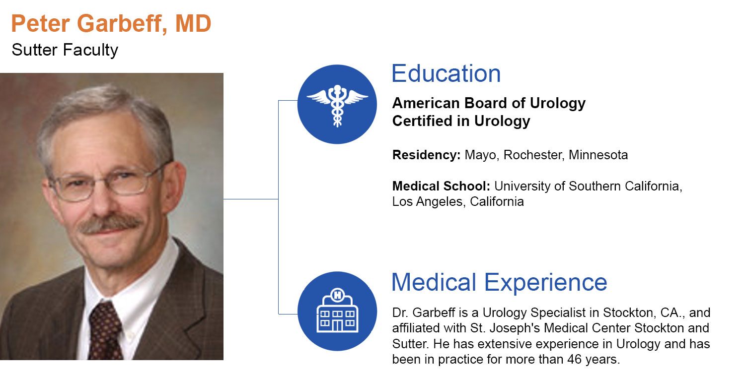 Medical Experience: Dr. Garbeff is a Urology Specialist in Stockton, CA., and affiliated with St. Joseph's Medical Center Stockton and Sutter. He has extensive experience in Urology and has been in practice for more than 46 years.
