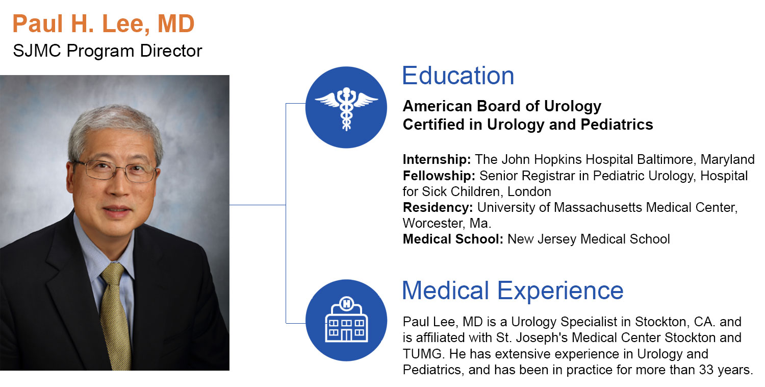 Medical Experience: Paul Lee, MD is a Urology Specialist in Stockton, CA. and is affiliated with St. Joseph's Medical Center Stockton and TUMG. He has extensive experience in Urology and Pediatrics, and has been in practice for more than 33 years.