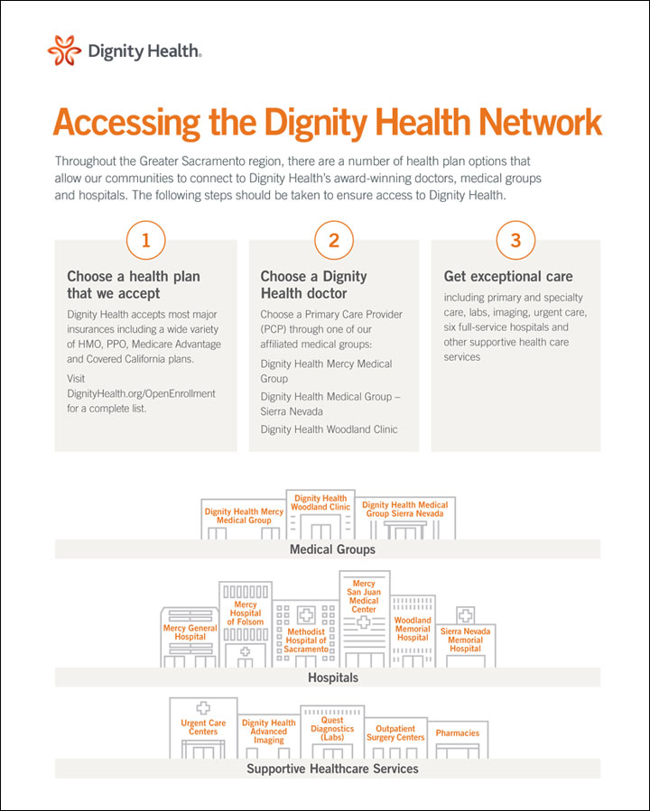 Dignity Health operates five hospitals across the Greater Sacramento Region — Mercy General Hospital, Mercy Hospital of Folsom, Mercy San Juan Medical Center, Methodist Hospital of Sacramento, and Woodland Memorial Hospital.