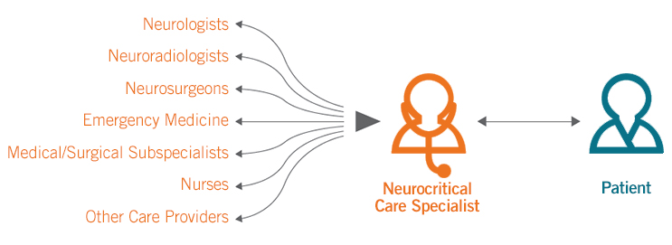 The neurocritical care doctor takes on the responsibility of various ICU specialists, providing support: