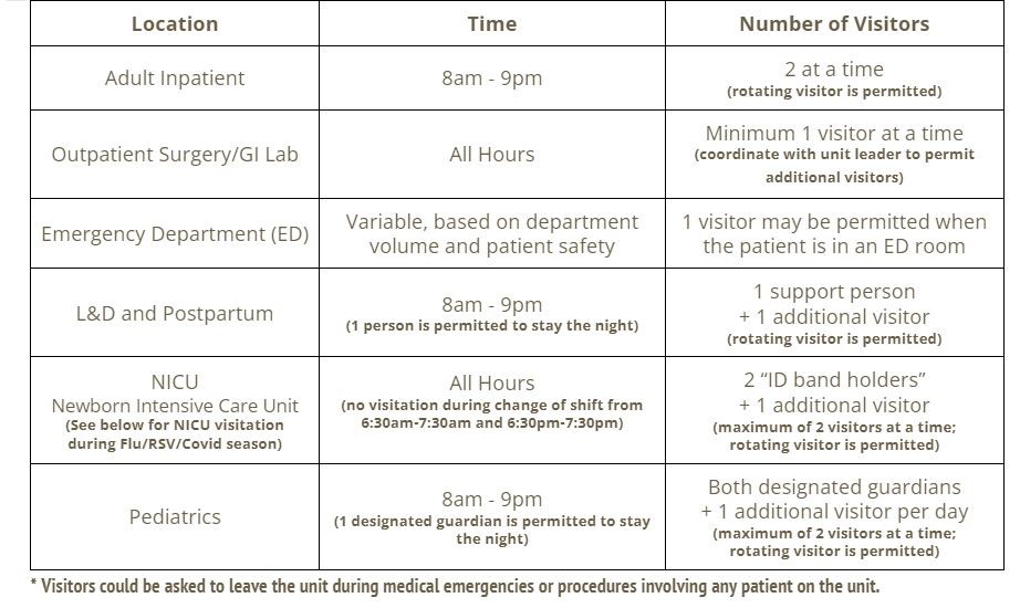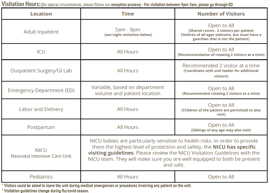 Los visitantes siempre han sido mucho más que un simple “visitante”. Son nuestros aliados en el cuidado del paciente. Los estudios muestran que tener a un ser querido cerca ayuda en la recuperación y la seguridad. Nada reemplaza la presencia de un ser querido cuando más se lo necesita. Agradecemos que las directrices nacionales y locales respalden nuestras prácticas de visitas.