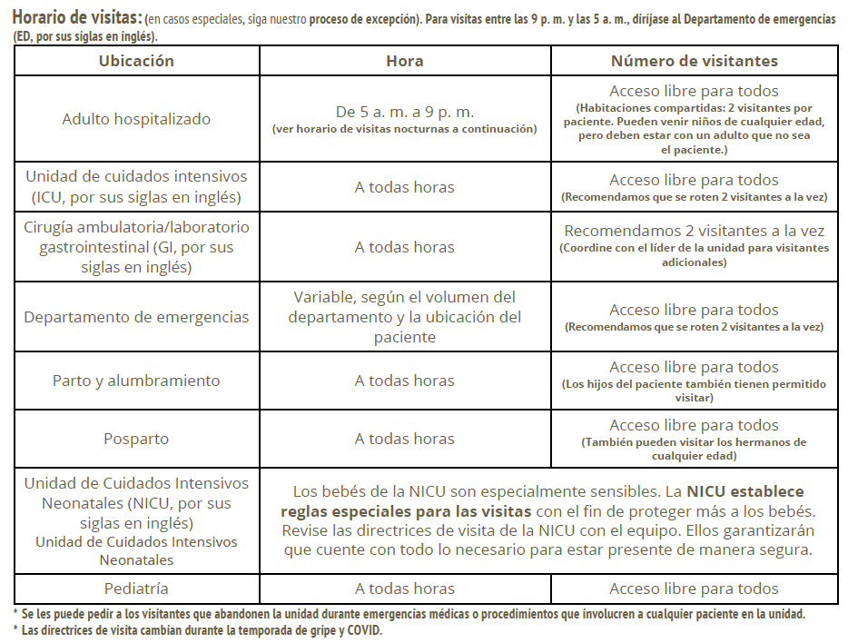 Hay veces en las que quedarse en la noche es beneficioso para nuestros pacientes, visitantes y cuidadores. La visita nocturna está permitida únicamente en habitaciones privadas que cuenten con una silla para dormir y debe coordinarse con el líder de la unidad y el supervisor de la casa. [Los menores no acompañados no pueden quedarse a dormir]
